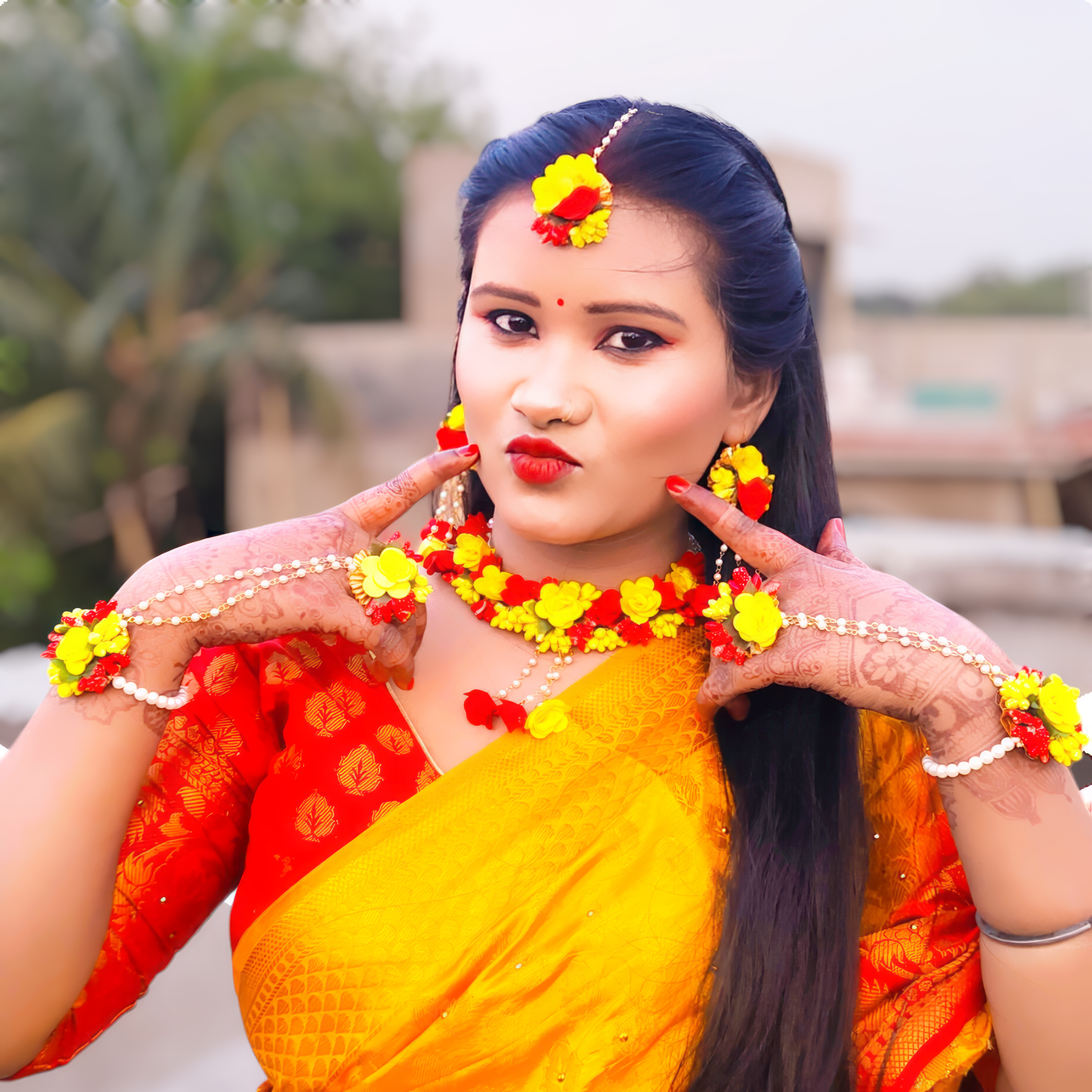 This floral haldi jewelry includes everything you need to complete your bridal look and create stunning photos. The complete haldi jewellery set is perfect for brides who want something cute, trendy, and unforgettable. From your entry to every selfie and candid picture, this haldi set will make sure all eyes are on you.